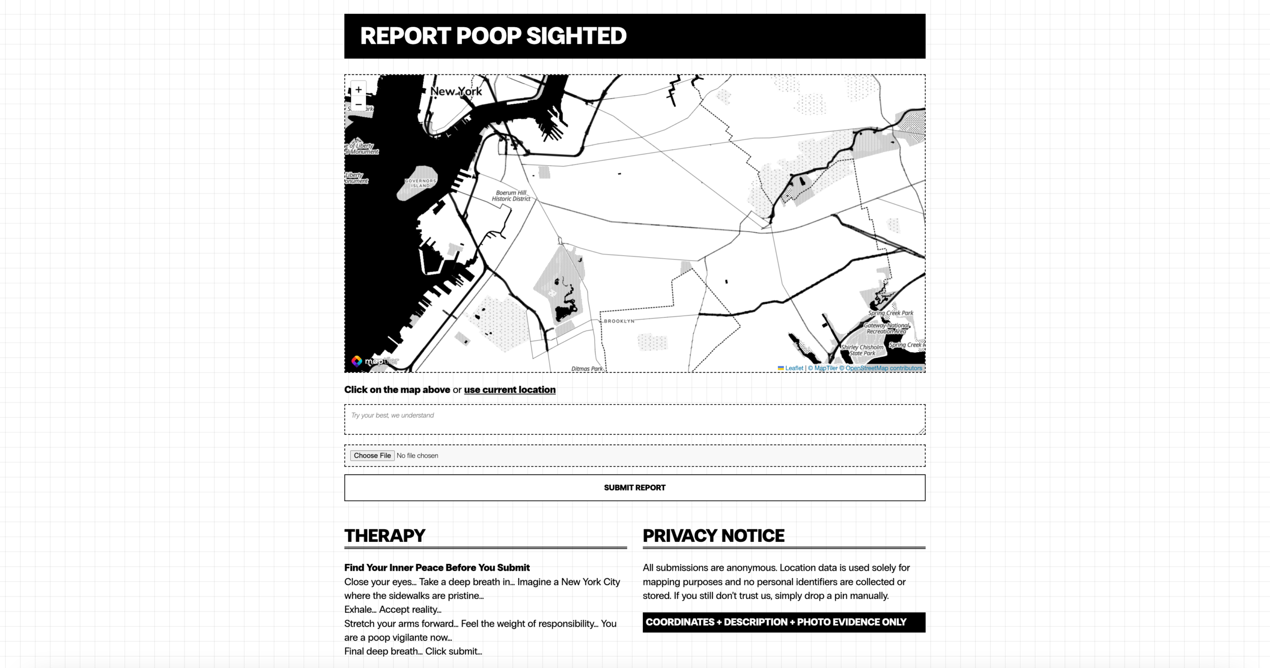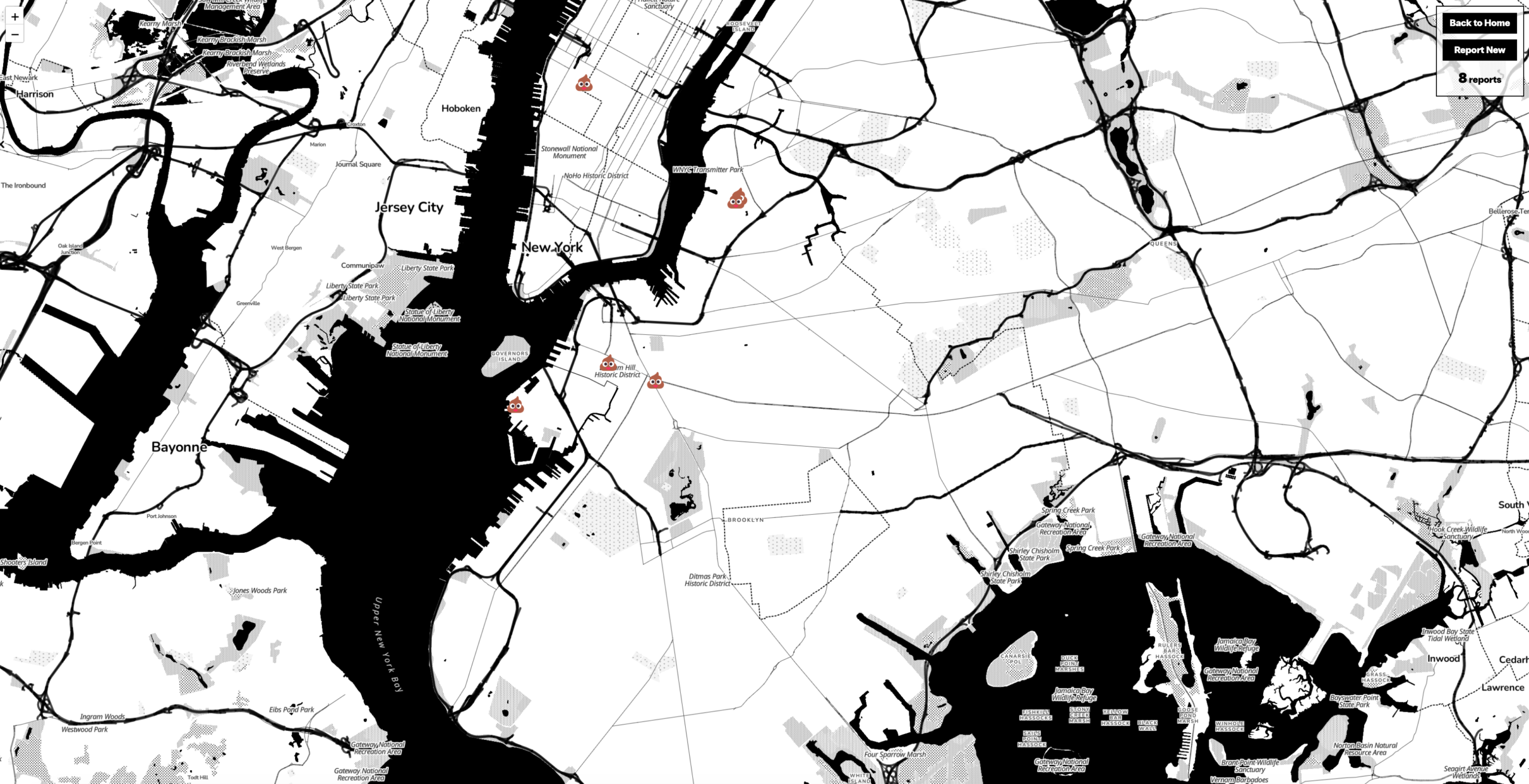 NYC Poop Map is a web-based crowdsourced platform where New Yorkers can mark and document the poop they encounter in the city. While inspired by Human Wasteland, which visualized waste in San Francisco, this project shifts the focus toward reimagining everyday waste as a site of community, belonging, and connection. By mapping something as universal yet stigmatized as poop, it challenges how we view the flaws of our shared home and reframes them as opportunities for dialogue and collective imagination.
